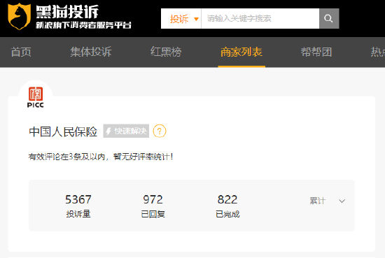 黑猫大数据中心投诉处理数据显示,截至2023年7月11日人保财险累计投诉3211件,回复率为0。其中,购车险返现优惠虚假承诺,官方拖延不处理的问题较为集中。