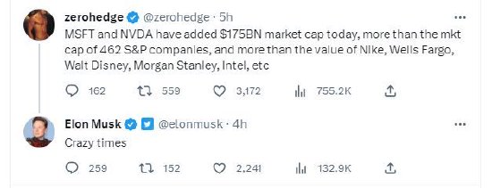 金融博客零对冲在推特上发帖称:“微软和英伟达的市值今天增加了1750亿美元,超过了462家标普成份股公司的市值,也超过了耐克、富国银行、迪士尼、摩根士丹利和英特尔等公司的市值。”