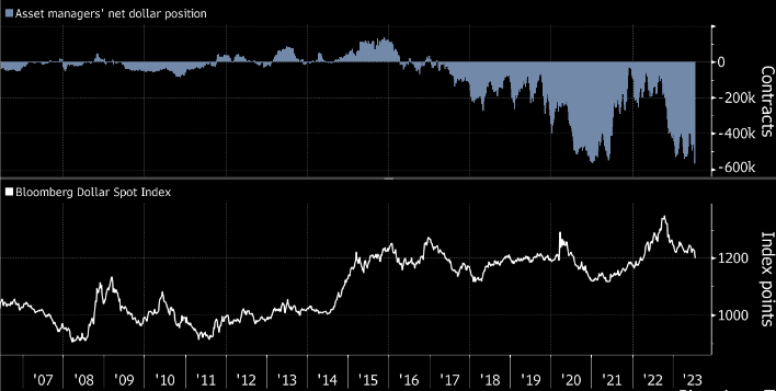 资产管理公司将美元空头头寸增至纪录高位,市场猜测美国通胀放缓将加速美联储长达16个月的政策紧缩周期走向终点。根据美国商品期货交易委员会(CFTC)的8种货币对数据以及彭博数据汇编,截至7月18日的一周,包括养老基金、保险公司和共同基金在内的机构投资者的美元净空头头寸增加18%,至568,721份合约。