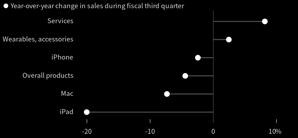 苹果第三财季iPhone销售收入令市场失望,第三财季iPhone销售额下降2.4%至397亿美元,低于预期的398亿美元。上季度iPad销售下滑20%,总销售额57.9亿美元,低于预期的63.3亿美元。Mac销售从大幅下滑中略有反弹,虽然销售额下降7.3%至68.4亿美元,但超过了平均预期的63.7亿美元。苹果上个季度没有推出新产品,仅仅只对高端台式机进行了小幅升级并发布更大尺寸的MacBook Air。预计本季度情况将完全不同,该公司料将推出iPhone 15和新一代Apple Watch。服务业务是当季财报中少见的亮点,销售额增长8.2%至212亿美元,超过预期的208亿美元。