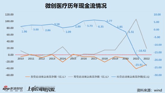 从现金流情况来看,2018年开始,微创医疗的经营活动现金流量净额持续下滑,目前已连续三年为负,投资活动现金流量净额也长期为负。而自心脉医疗2019年成功上市起,微创医疗便开始通过分拆子公司上市、引入新投资者等方式持续融资,筹资活动现金流量净额在2019-2021年三年持续走高。