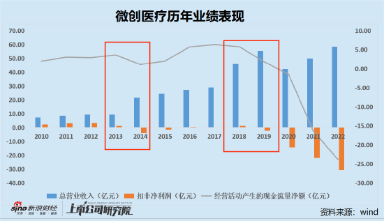 Wind数据显示,2014年和2018年,微创医疗总负债相比上一年分别增加了28.69亿元和20.84亿元,同时2019年经营活动产生的现金流量净额大幅降低,公司扣非净利润再度陷入亏损。