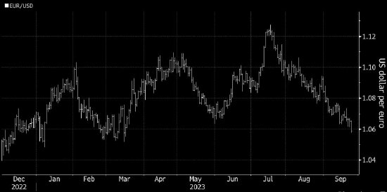欧元兑美元周一一度下跌0.9%至1.0480,为去年12月以来的最低水平,延续了自7月以来的跌势——当时欧元触及16个月高点。