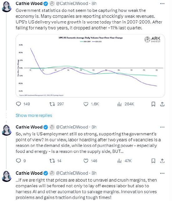 伍德接着写道:“那么,为什么美国的就业仍然如此强劲,支持政府的观点呢?在我们看来,两年的空缺后劳动力的囤积是需求侧的一个原因,而购买力的丧失——尤其是食品和能源——是供给侧的一个原因,但是……如果我们关于价格即将崩溃并挤压利润率的预测是正确的,那么企业不仅将被迫裁员,还将被迫利用人工智能和其他自动化技术来挽救利润率。创新解决问题,在困难时期获得动力!”