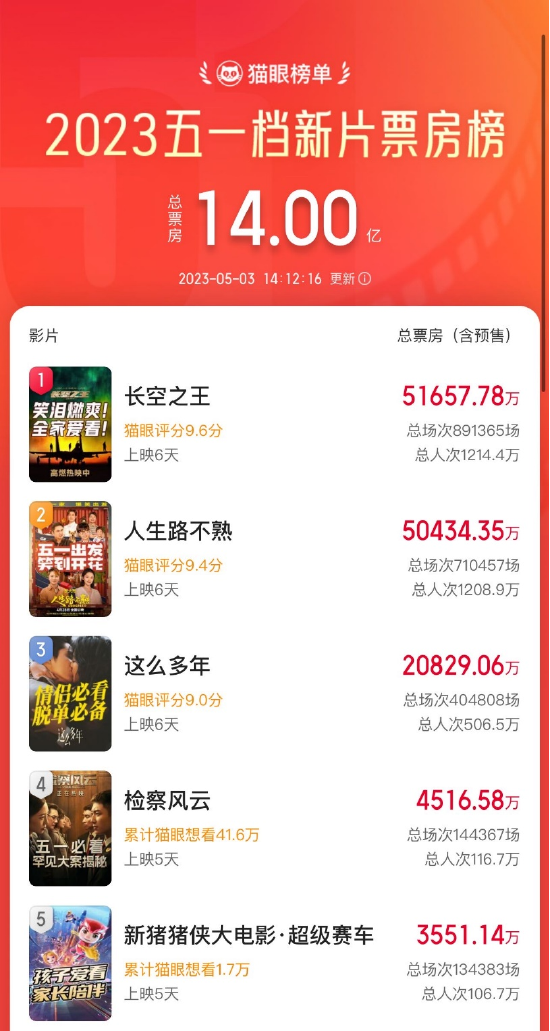 今年五一假期第3天,五一档(4月29日-5月3日)档期总票房就突破了10亿元。根据猫眼专业版数据,截至5月3日14时,档期新片票房突破14亿元,《长空之王》、《人生路不熟》和《这么多年》分列档期累计票房榜前三位。