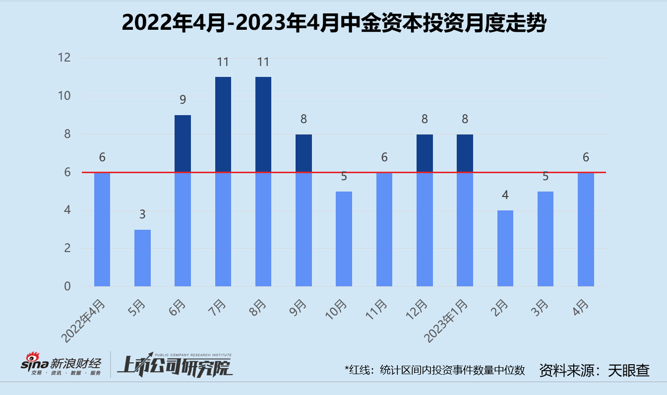 统计区间内,中金资本公开披露的股权投资事件共6起,同比持平,环比增长20%。往期数据显示,在一级市场普遍悲观的2022年,中金资本仍保持平均每月5-6个项目的投资频率。而全面复苏的2023年,中金资本却显得相对谨慎,直至4月才彻底恢复至2022年同期水平。