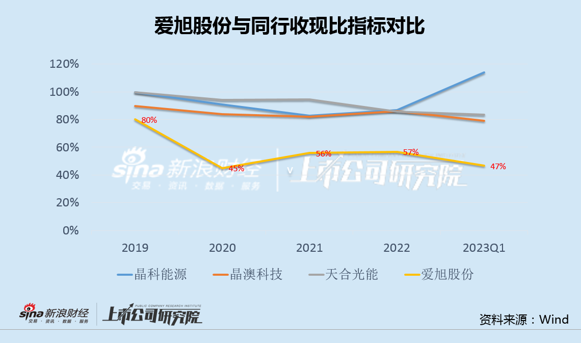而与巨额投入不同的是,爱旭股份收现比却显著低于同行,显示回款或存在较大压力。