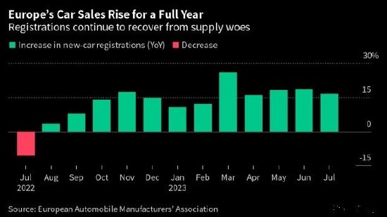 欧洲汽车制造商协会周三公布的数据显示,欧洲7月新车注册量增长17%,至102万辆,连续第12个月实现增长,因电动汽车需求强劲和零部件供应改善。