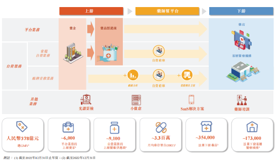 平台业务是药师帮整体业务的基石,通过数字化平台无缝连接上下游,大大简化院外医药市场的多层结构和医药交易流程,起到极强的上下游聚拢效应。截至2023年6月30日,平台业务上游供应商数量约7,100个,可提供约330万个SKU,覆盖超589,000个买家。