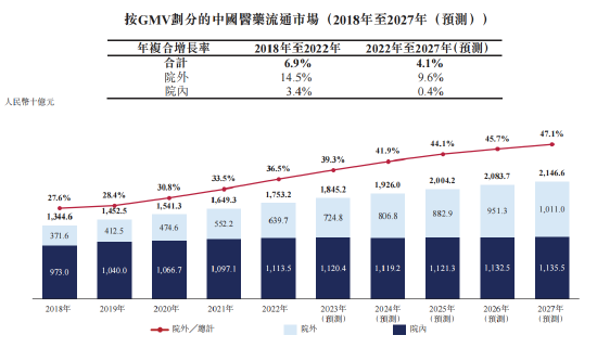 根据Frost&Sullivan数据统计显示,中国院外医药流通市场规模由2018年的人民币3,716亿元增至2022年的人民币6,397亿元,年复合增长率为14.5%,占整体医药流通市场的相应百分比由2018年的27.6%增至2022年的36.5%。