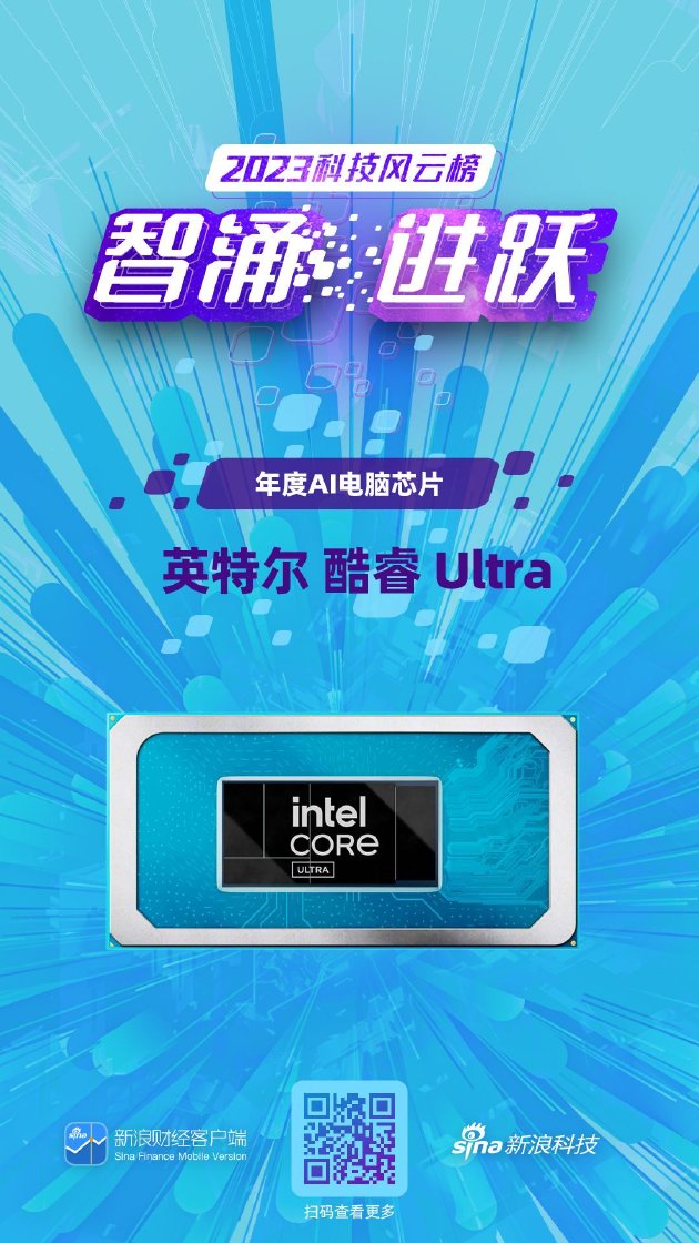 其中,英特尔 酷睿 Ultra获得新浪2023科技风云榜——【年度AI电脑芯片】奖项。